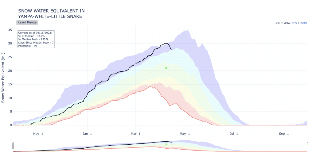 Between April 1 and 8, the area had record snow water equivalent as the measurement surpassed 29 inches and reached 30. With the melt, the 2023 snowpack is back below the record trajectory, which was set in 2011.