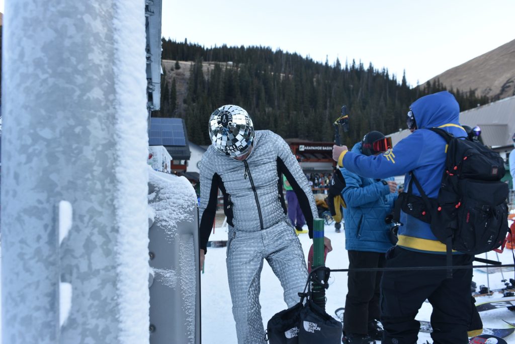 People couldn’t miss the first chair crew if they tried thanks to skier Darren Droge’s, or “Disco Darren,” custom disco-ball inspired helmet engraved with sayings like “The Legend,” a reference to the colloquial slogan for the resort, and his silver ski outfit.
