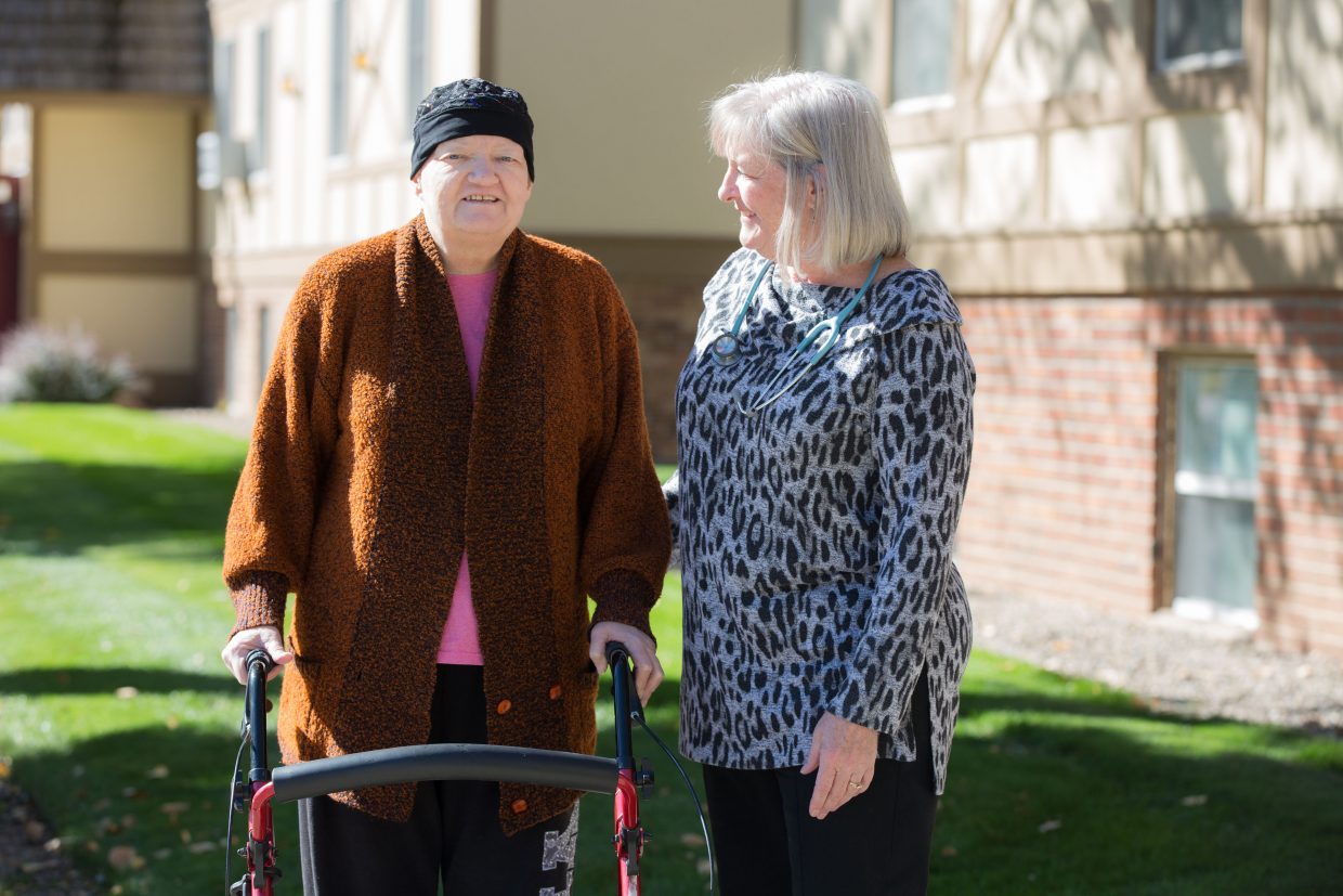 Parri is a Home Health and Hospice nurse with Northwest Colorado Health. She checks Bevard’s heart, lungs and blood pressure and chats with her about symptoms, medications, diet and safety in her home. Then they take a short walk along the leaf-covered sidewalk in the neighborhood.