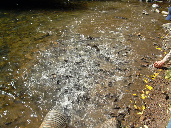 A truck from Rifle Falls delivered 40,000 fish. It contained four tanks. Each contained 10,000 trout, and oxygen tanks injected oxygen into the water.