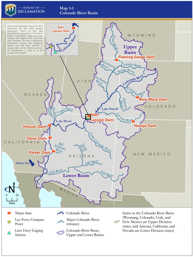 While the four Upper Basin states in the compact — Colorado, New Mexico, Utah, and Wyoming — rely predominantly on snowpack for water supply, the Lower Basin states — Arizona, California, and Nevada — rely on releases from Lake Powell and Lake Mead.