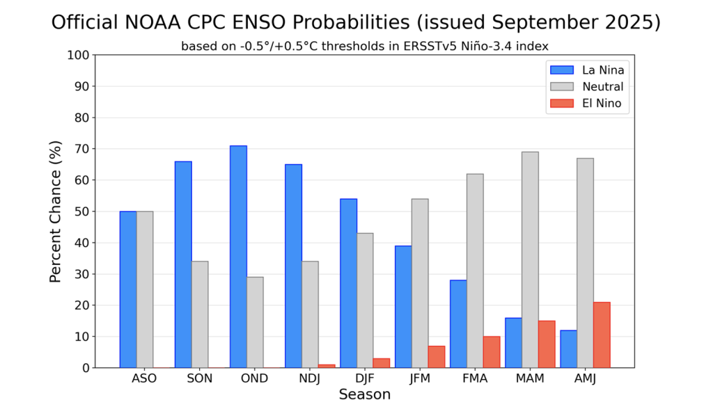 This only shows a lean toward La Niña because the threshold “must be met for five consecutive 3-month overlapping periods” for it to officially be classified as a La Niña. However, the National Oceanic and Atmospheric Administration’s latest outlook shows a 71% chance of La Niña from October to December, with neutral conditions returning by spring.