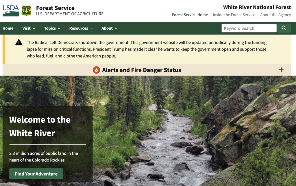Government websites, including Arapaho and Roosevelt National Forest, blame “Radical Left Democrats” for shutdown
