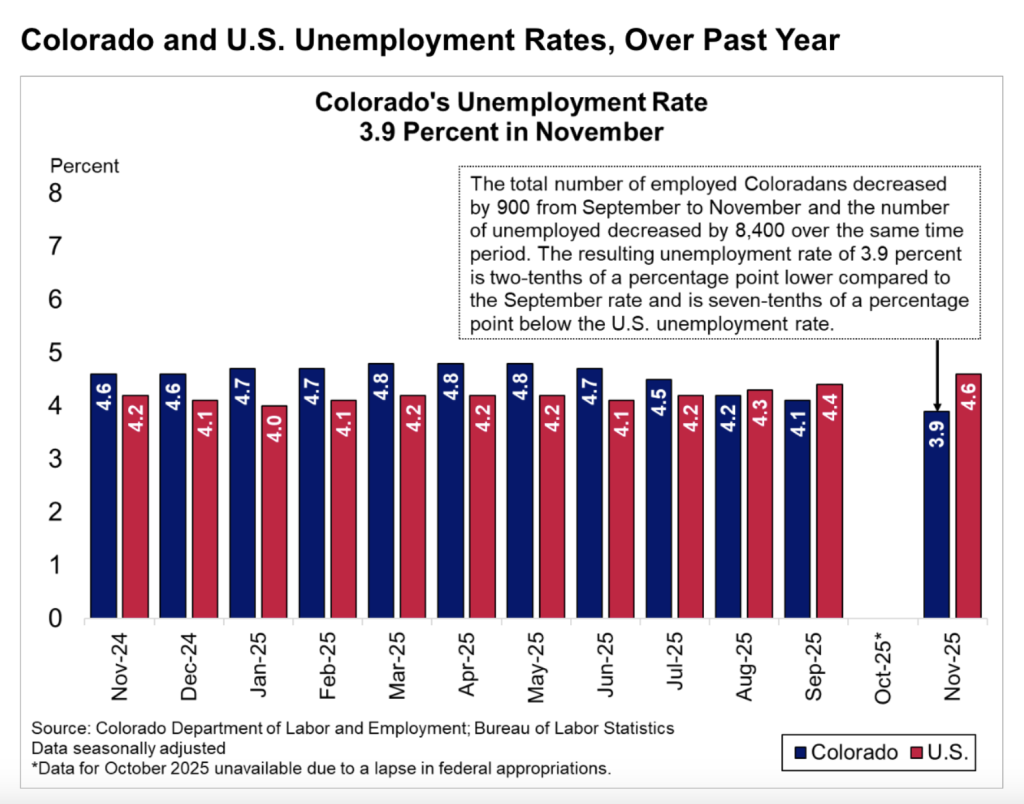After climbing for most of 2025, Colorado’s November unemployment rate fell under the 4% threshold for the first time in over a year.