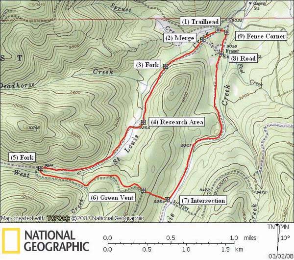 Tour Description – Follow the St. Louis Loop trail straight ahead. Merge with a road from the left (2), and continue straight. The trail follows a road used to monitor experiments throughout the Fraser Experimental Forest. This road is closed off for snowmobile use, with the exception of forest service employees, who may occasionally be seen conducting research. Gently climb through the montane forest of lodgepole pine, spruce, and fir trees. At the fork and trail marker (3), the Deadhorse Creek Loop trail is on the right and the St. Louis Creek Loop trail is on the left. Take the left fork and continue on the road. Ahead on the left is a research area (4) where snow depth and snow melt are measured. Please do not disturb this area. Beyond the research area are a couple of small clearings with a view of the side of Bottle Peak. At the next fork and trail marker (5), the Byers Peak trail is on the right and the St. Louis Loop trail continues on the left. Turn left down the short hill where the trail is level. Follow the road through the woods. Look for a green vent (4′ high metal pipe) (6), which is on the left. From this vent, the road continues to the right, but turn left down a clear-cut hill for .2 miles. This hill is very steep with several dips, but a lot of fun. At the bottom of the hill is a 4-way road intersection (7), which is closed to motorized traffic during the winter. From the bottom of the hill, turn left (north-north-east), and descend gently along the road. Parallel the creek and follow the road all the way to the beginning of the plowed road (CR 73) (8), and the Fraser Experimental Forest Headquarters. Follow the brown fence beside the left bank of the road to the fence corner (9). Turn left and follow the fence to the trailhead (1).