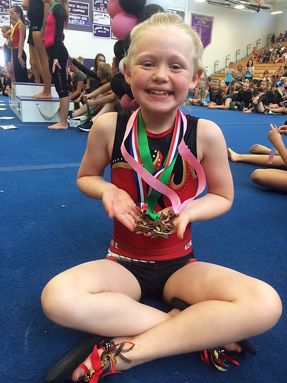 This spring and summer saw 16 girls and three boys compete for the Alpine Gymnastics team. We had fifteen girls make it to the regional competition held on July 15 and 16 at Elizabeth High School, in Elizabeth, Colorado. The competition was steep but seven placed in the top six in their level and age group to qualify them for the State Championships on July 22 and 23 at Arvada West High School: Alana Krueger, Emma Lence, Olivia Maurais, Grace Schneider, Sofia Olsson, Georgia Martin, and Georgia Harvey.