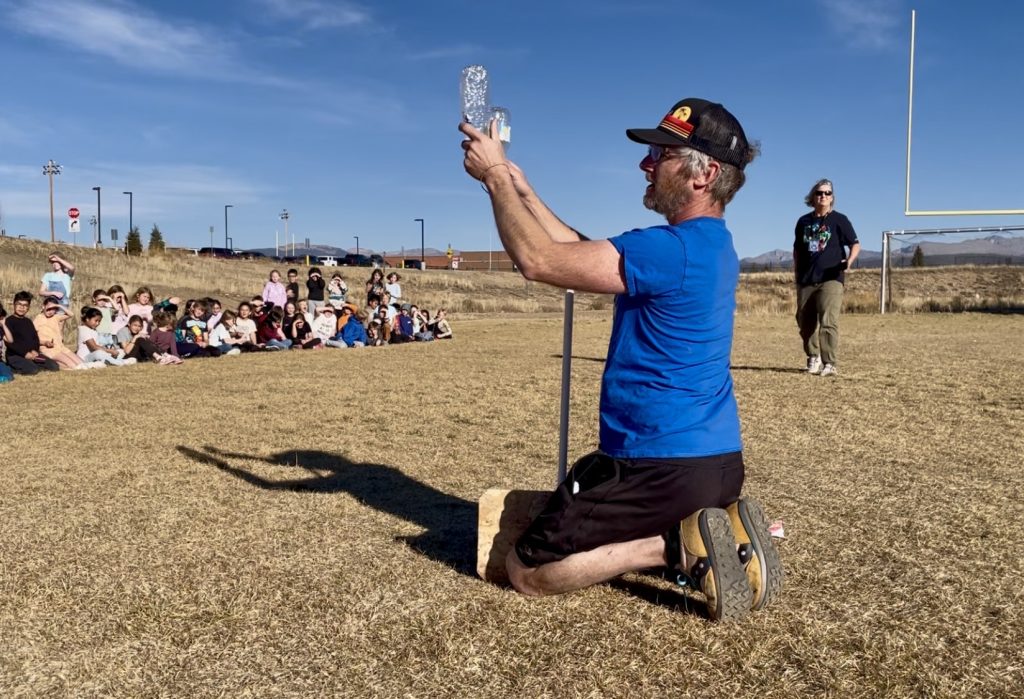 Outside Granby Elementary School, third and fourth graders roared as paper rockets shot to the sky. Granby dad Nathan Thum built the launchers to help students explore energy and motion.