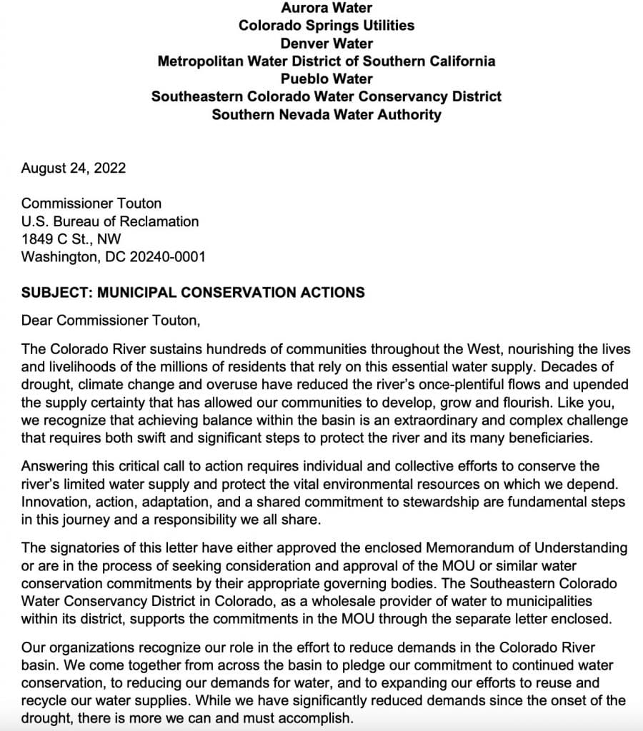 “Achieving the protection storage volumes needed to preserve water and hydropower operations within the Colorado River basin cannot be met by a singular country, basin, state, or water use sector,” continued the letter to the Bureau of Reclamation. “While municipal water use represents only a small fraction of total Colorado River water use, progress begins with one and then many until we are all moving in the same direction.”