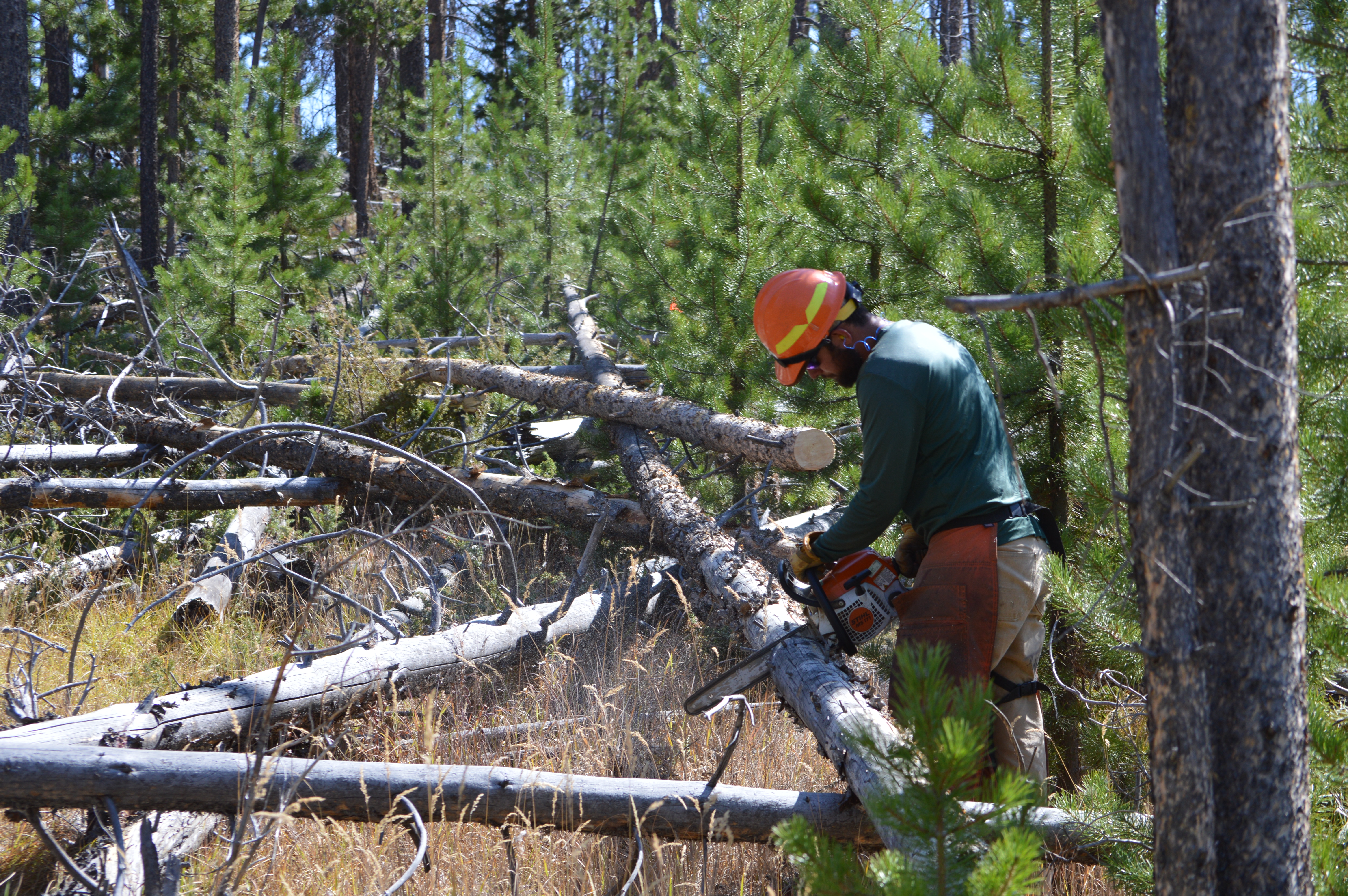 - Toby Martin, a Headwaters Trails Alliance employee, cuts larger trees into smaller pieces to make it easier to move them from the trail.
