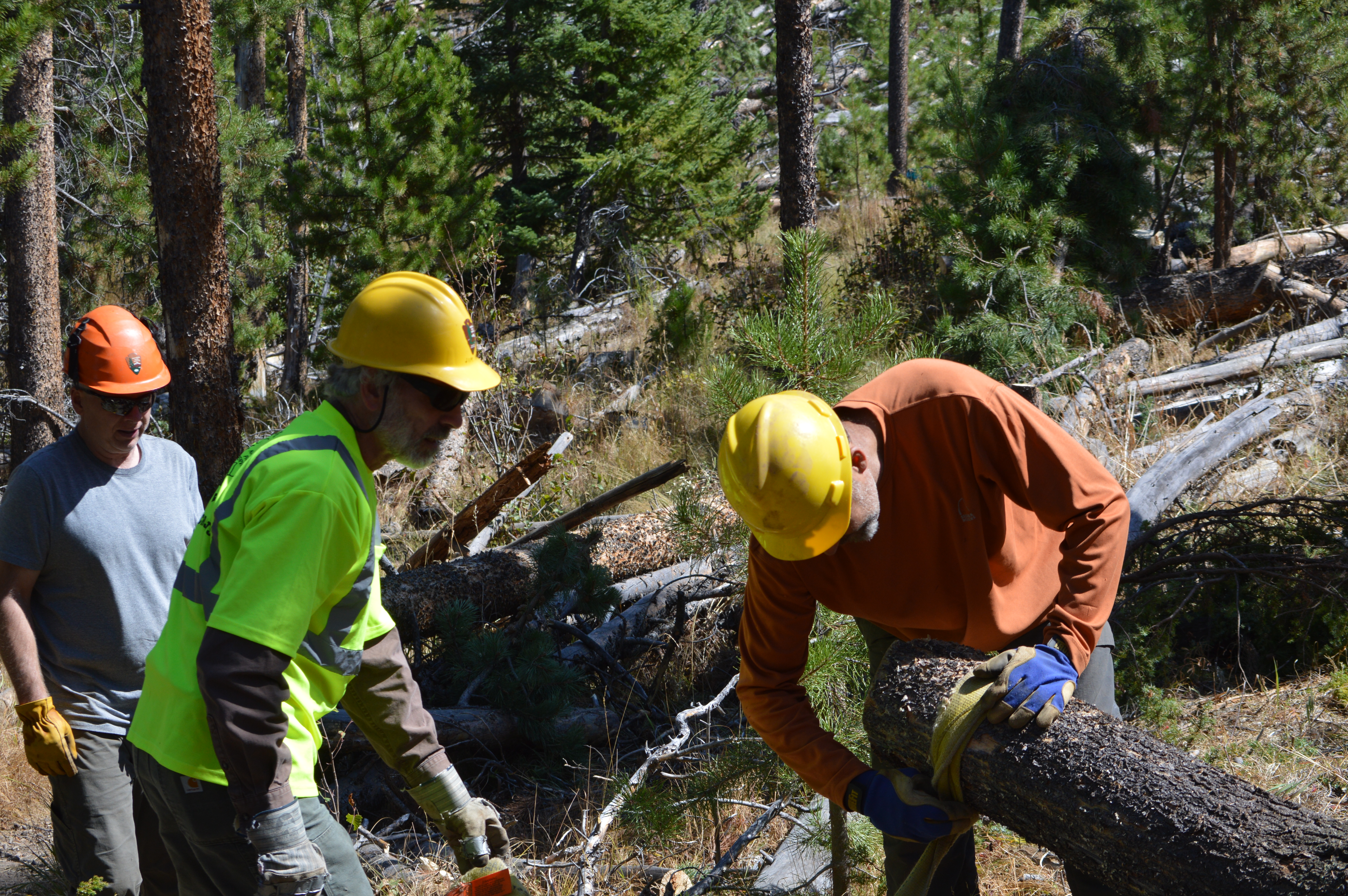 - Dave Runck, Jim Mills and Chris Bennett pull stumps from the new trail path. Runck, who is from Golden and owns a home in Fraser, said he spends a lot of time on the trails and wanted to give back.