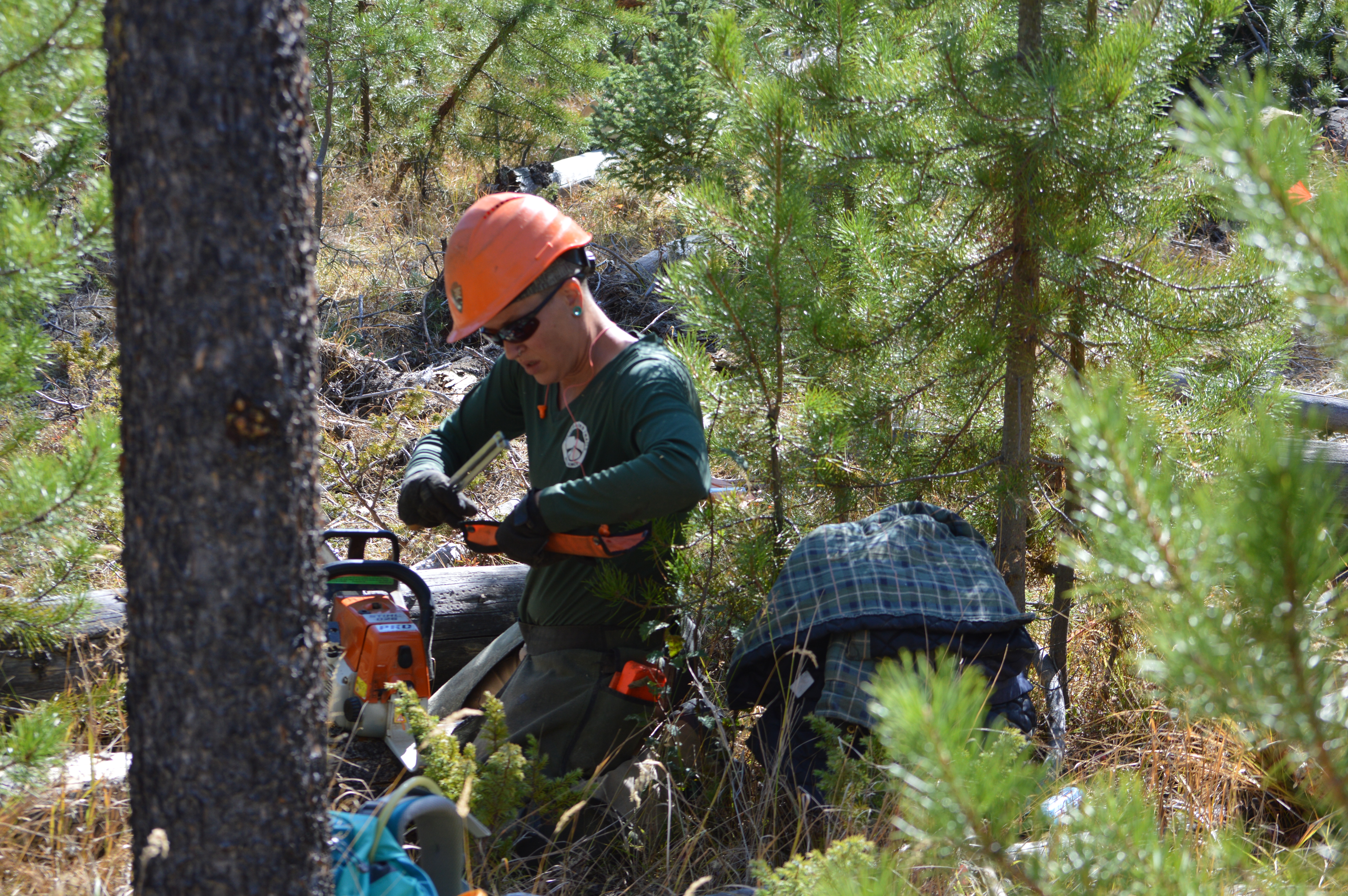 - Izzie Ditmarson, a Headwaters Trails Alliance employee, sharpens her saw. One of the main safety concerns with rerouting the East Shore Trail was the dead standing lodgepole pine in the area, which HTA worked to down before volunteers arrived.