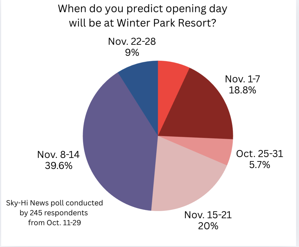 245 Sky-Hi News readers attempted to guess opening week at Winter Park Resort. The most popular choice, Nov. 8-14, was over a week late. The correct answer, Oct. 25-31, received only 5.7% of the vote. Winter Park Resort announced today that they will open on Halloween for the 2025-26 season.