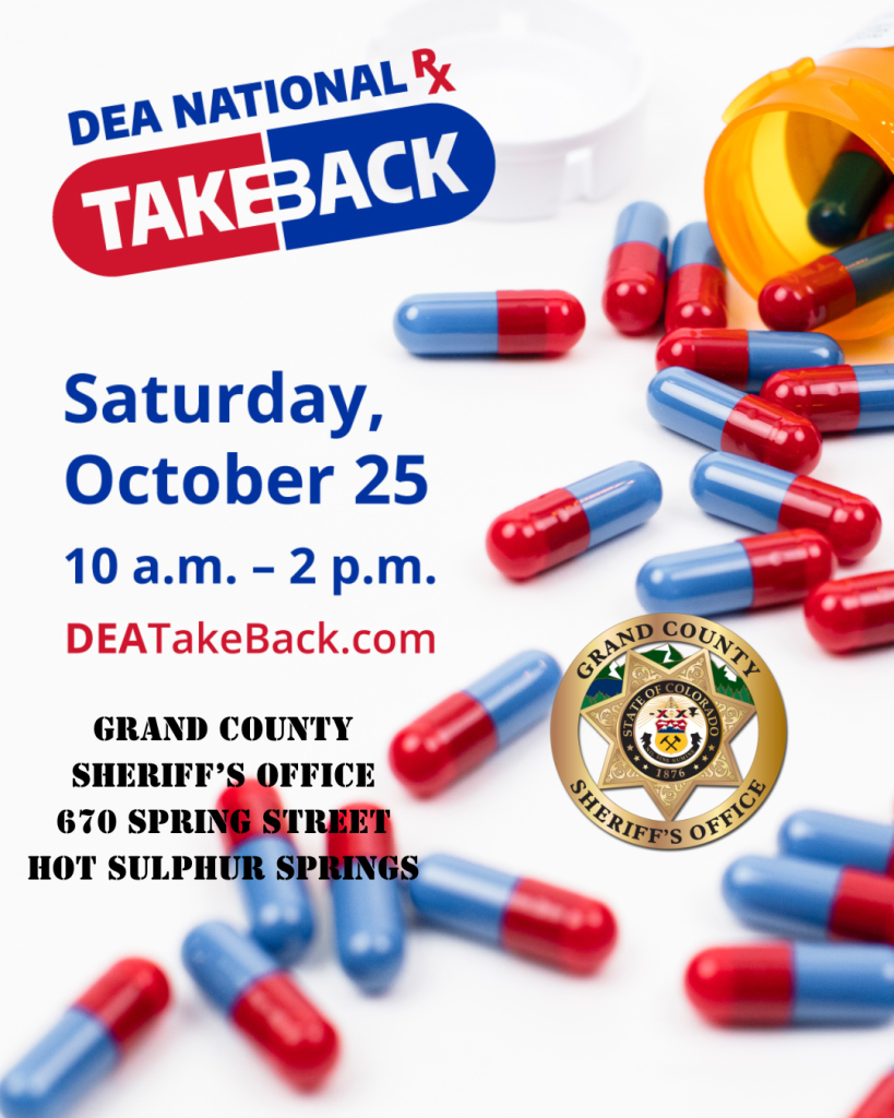 The Grand County Sheriff’s Office is participating in National Drug Take Back Day. The event goes from 10 a.m. to 2 p.m. Saturday, Oct. 25, at the sheriff’s office in Hot Sulphur Springs.