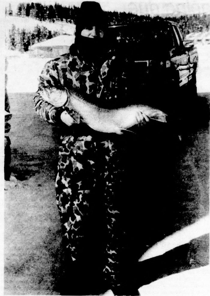 Several local residents were among the top winners in the Grand Lake Ice Fishing Contest held on the first weekend of February 1996 in the waters of the Three Lakes. Claiming the top prizes were Clarence Archuleta of Granby, whose 2.20 lb. fish earned him $1,000 in the rainbow trout category, and Linda Craighead of Grand Lake, who won a 1996 Ski-Doo snowmobile in the lottery drawing. Bryan Johnson, 16, of Arvada, caught the largest fish of anyone during the three-day fishing contest, a 38-inch, 18.67-pound mackinaw — as a youth competitor the catch earned him a $100 savings bond. The three-day event had 2,519 adults and 260 youngsters participating.