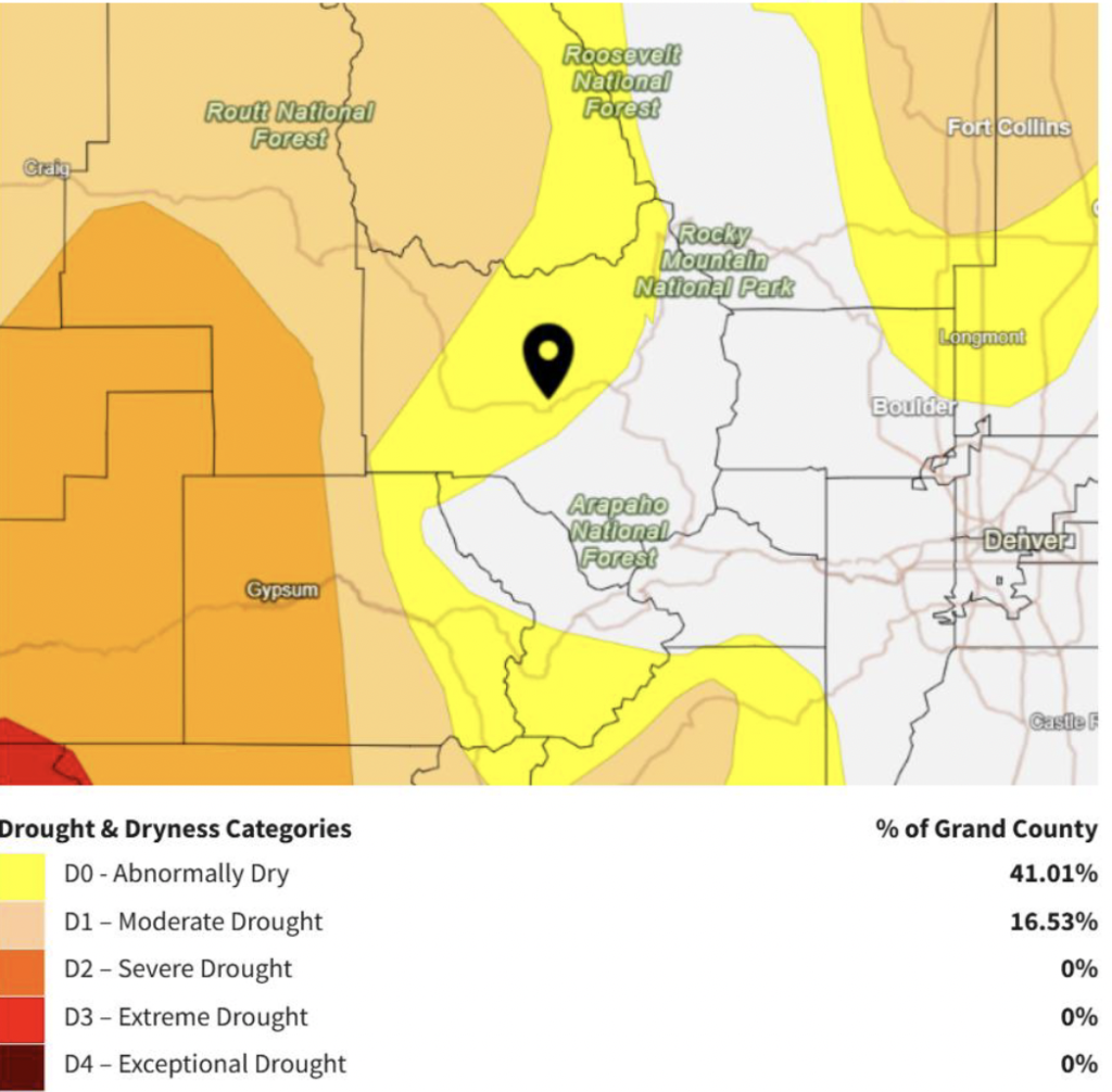 The Grand County Drought Preparedness Committee has declared the county is currently under Drought Watch. According to the U.S. Drought Monitor, 51% of Grand County is currently classified as “abnormally dry” and 4% as being in “moderate drought.”