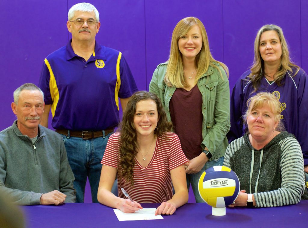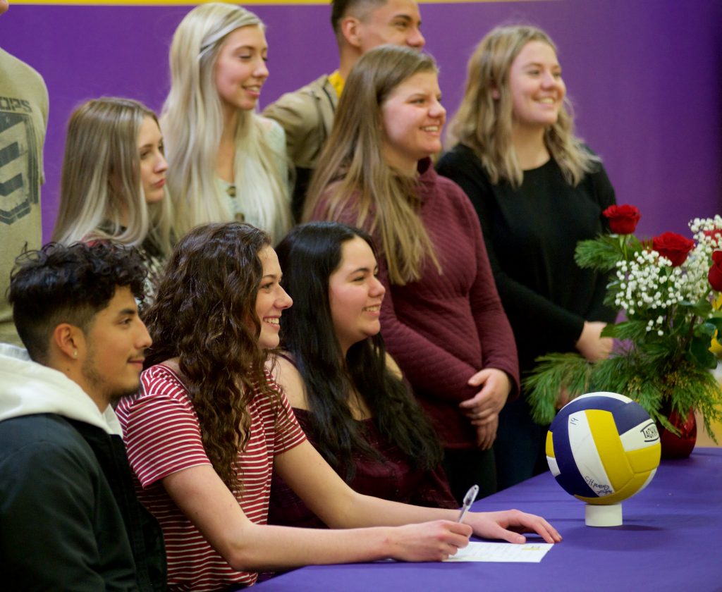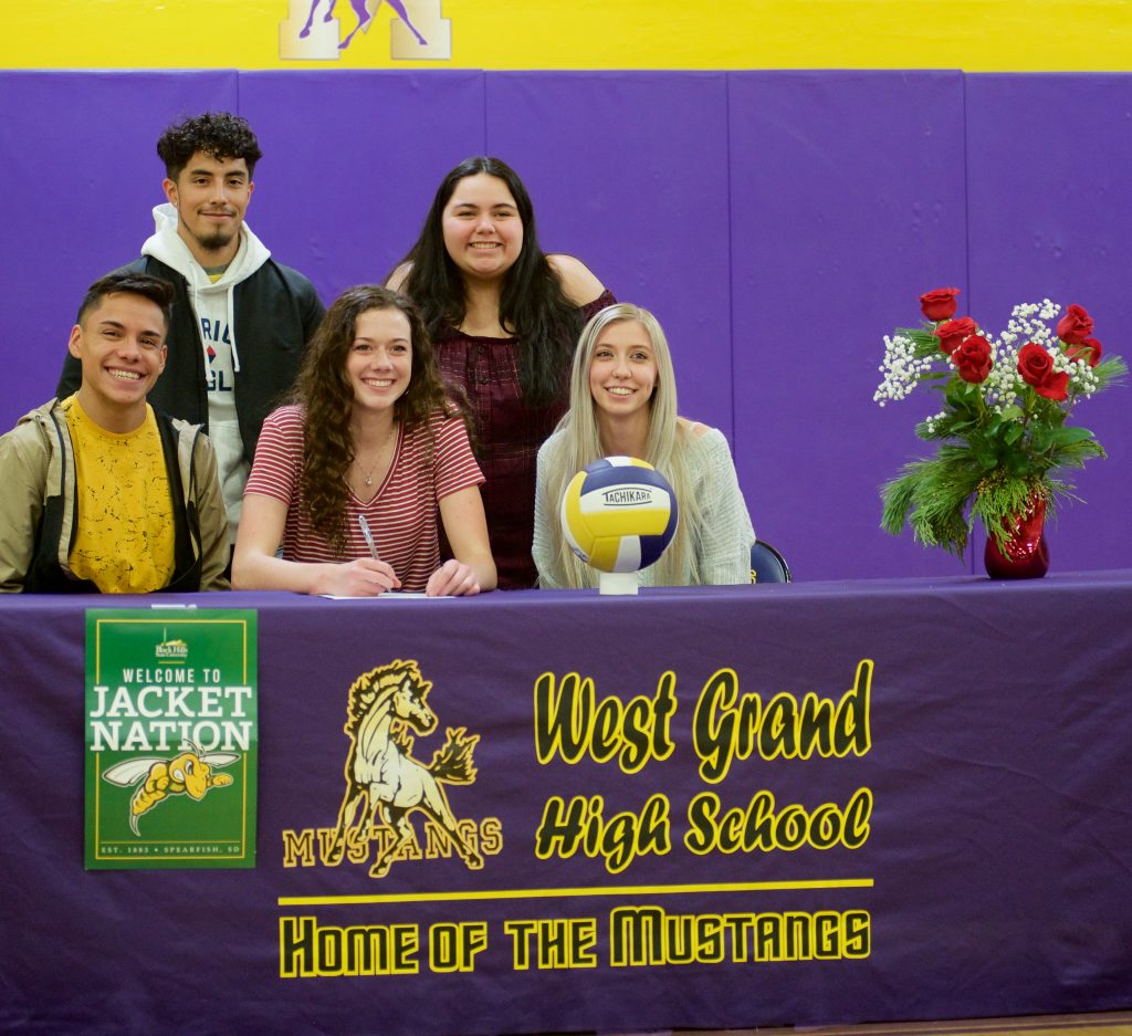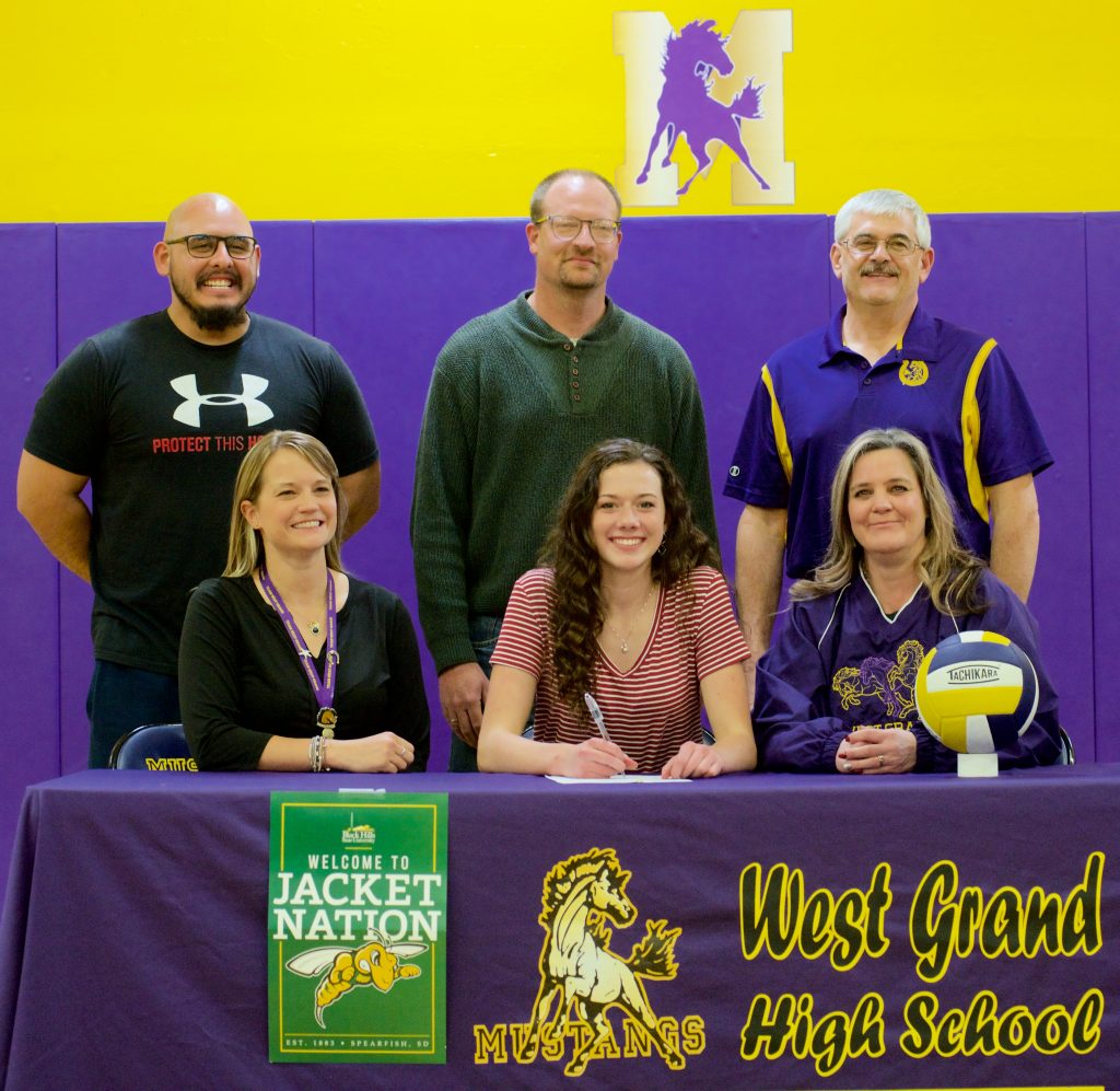 Flanked by her coaches, classmates and parents, West Grand senior Emma DeSanti signed a letter of intent to play volleyball for the Black Hills State University in Spearfish, South Dakota.